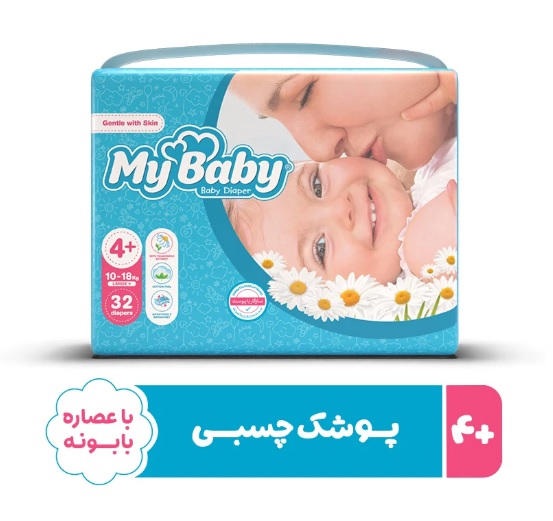 ویژگی های پوشک مای بیبی سری مهربان با پوست مدل chamomile سایز 4plus بسته 32 عددی